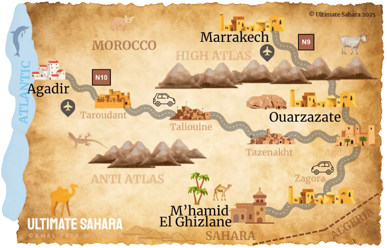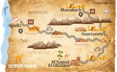 All our tours start in M’hamid El Ghizlane, gateway to the Sahara. We can provide accommodation on the night before your trek and get you there from Marrakech, Agadir or Ouarzazate, or you can arrive under your own steam and book your own hotel, giving you the flexibility to create the perfect trip.
