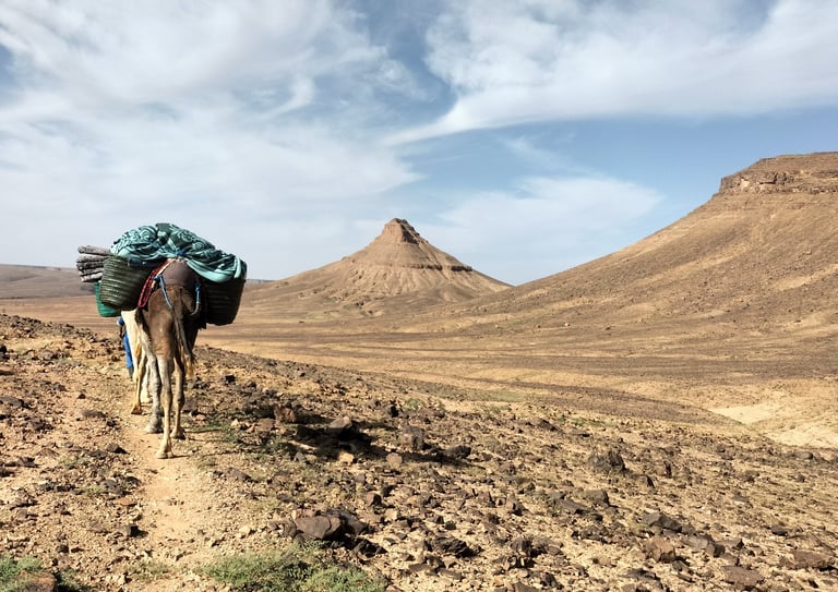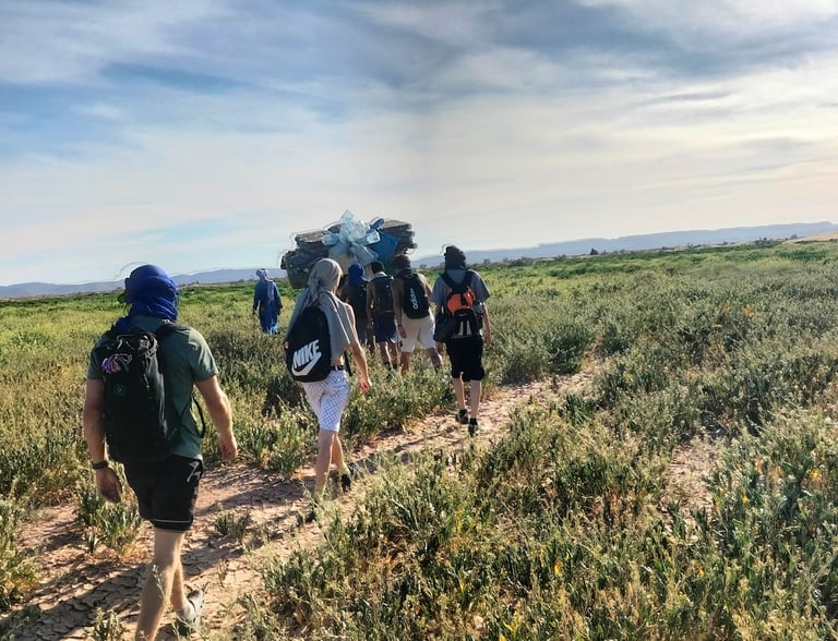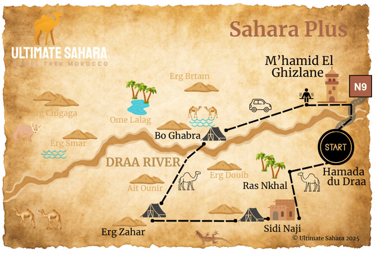 At sunrise, we head through the dried-up River Draa Valley, observing the forest of dead tamarisk trees and the remains of animals that once lived in these parts. After stopping for lunch at Erg Tannour, we reach the dune field of Erg Bo Ghabra, where we set up camp for the final night. Here, you can enjoy a refreshing wash in the natural waters of a nearby well, where you may encounter camels having a drink.