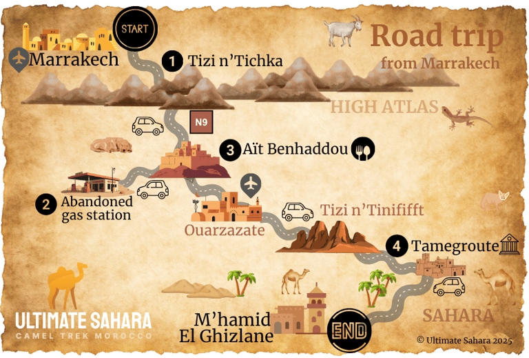 Door-to-door transfer from a location of your choice to your hotel in M'hamid