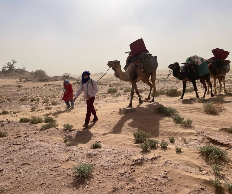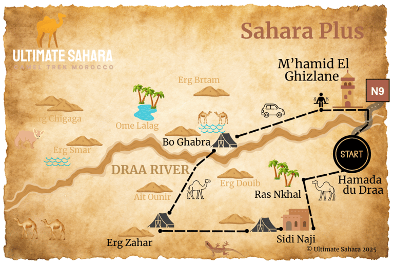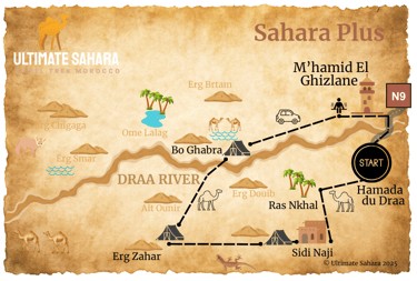 At sunrise, we head through the dried-up River Draa Valley, observing the forest of dead tamarisk trees and the remains of animals that once lived in these parts. After stopping for lunch at Erg Tannour, we reach the dune field of Erg Bo Ghabra, where we set up camp for the final night. Here, you can enjoy a refreshing wash in the natural waters of a nearby well, where you may encounter camels having a drink.